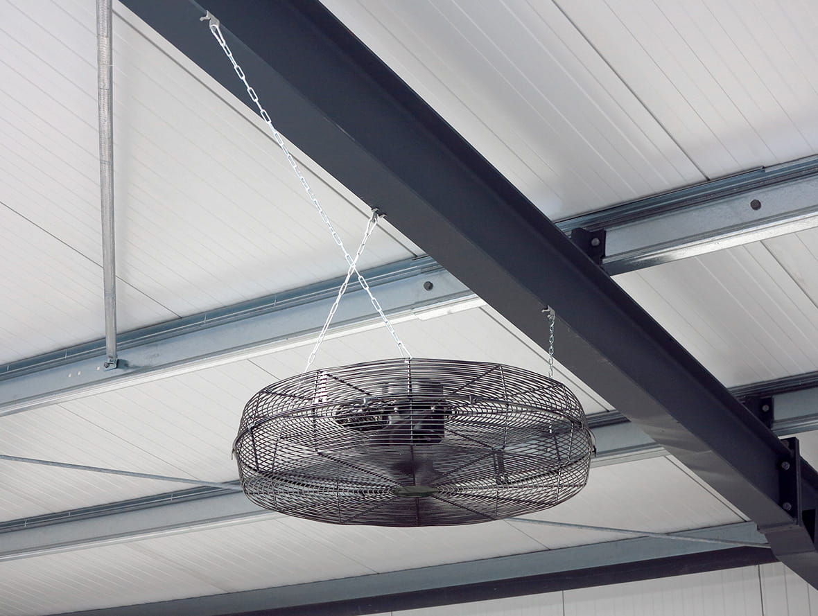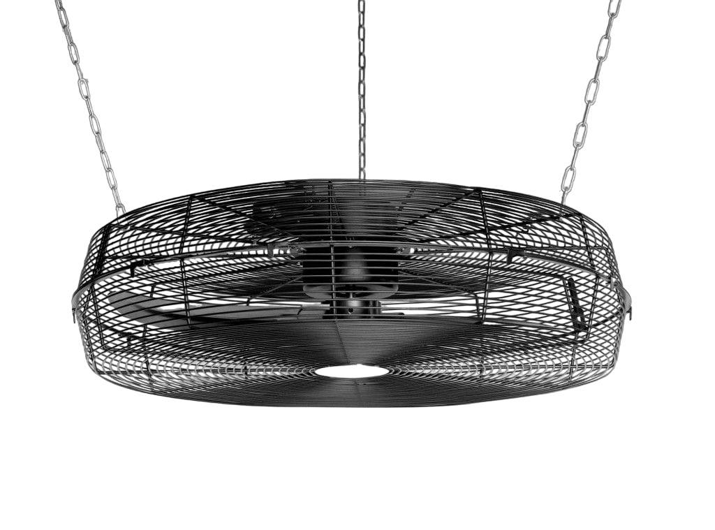 Wentylator przemysłowy dla hal i pomieszczeń wysokich z siatką ochronną.